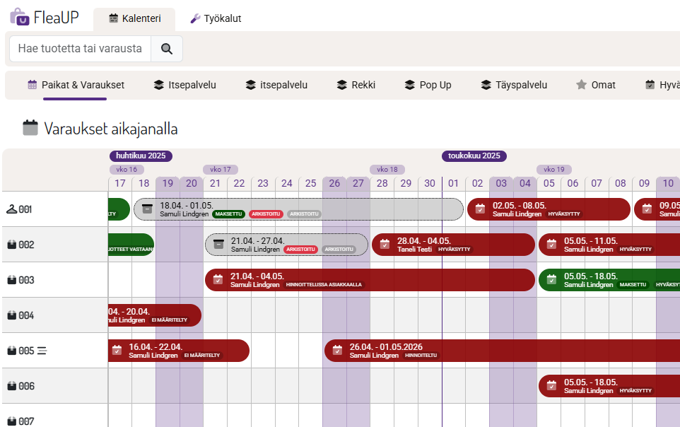 FleaUP -järjestelmän toiminnan ytimessä on varauskalenteri, jonka aikajanalta näet kaikki paikkavaraukset värikoodatusti. Tämä tehokkaan näkymän kautta pystyt seuraamaan kokonaisvaltaisesti varaustilannetta.