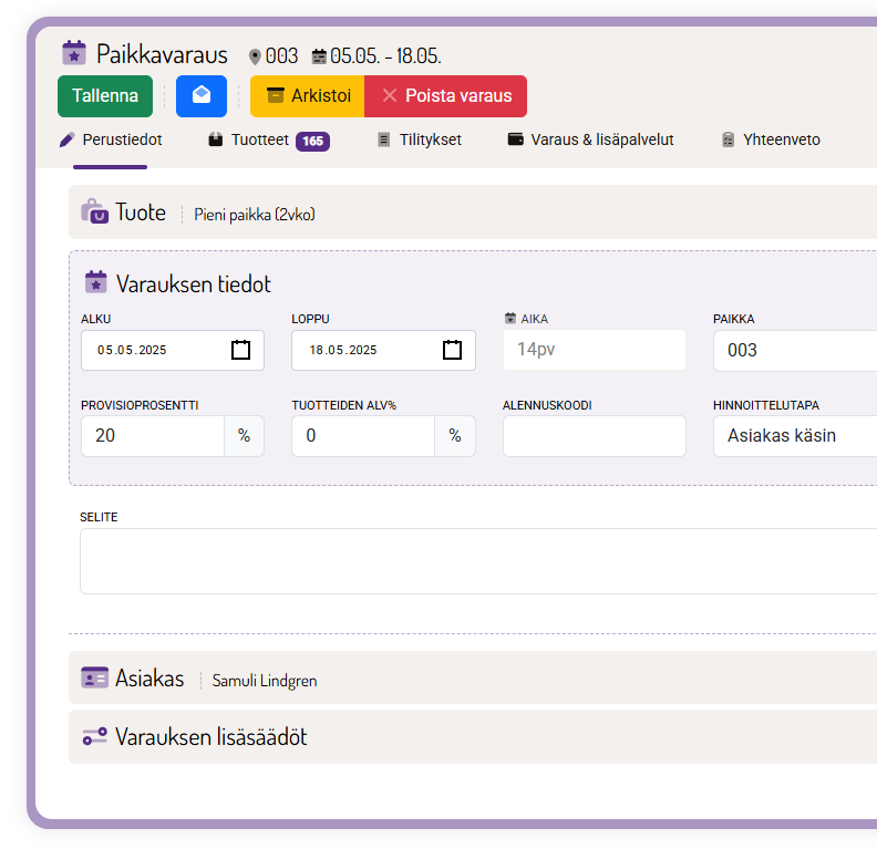 Varauksen ylläpitäminen, asiakkuuden hallinta, tilitykset, lisäpalveluiden myynti - siis kaikki paikkavaraukseen liittyvä, tapahtuu yhdestä ikkunasta.