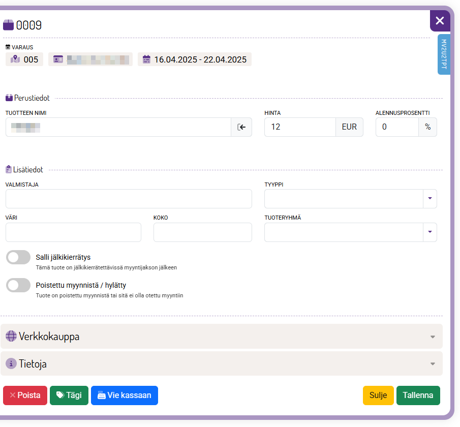 Tuotteelle voidaan tallentaa nimen, hinnan ja alennusprosentin lisäksi myös muita tietoja esimerkiksi tuotteen hinnoittelun helpottamiseksi. Sen lisäksi on mahdollista tuote- tai varauskohtaisesti sallia tuotteiden jälkikierrätys.