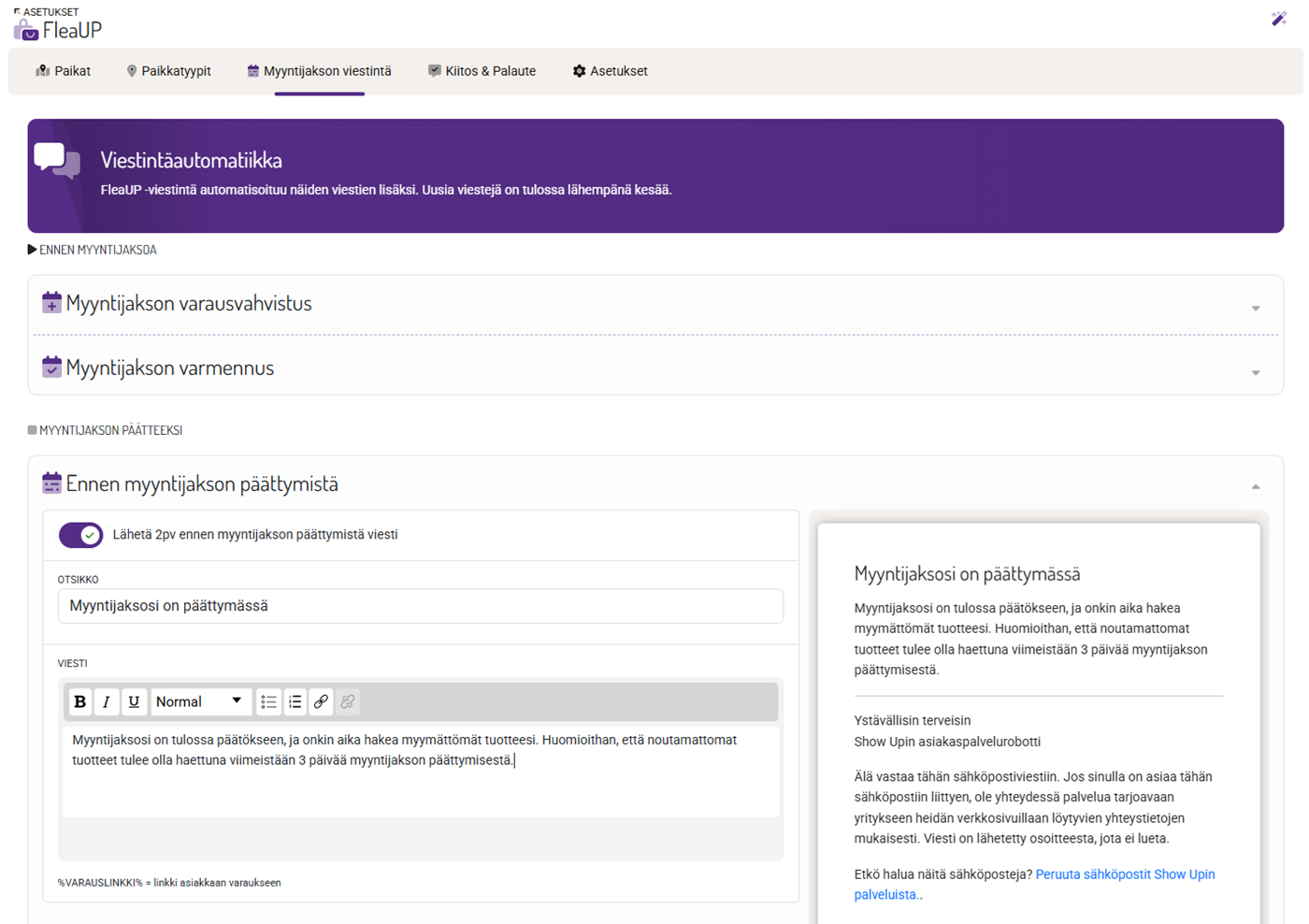 Järjestelmä lähettää automaattisesti (tai valittuna) asiakkaalle varaukseen liittyen varausvahvistuksen sekä hyväksyttävissä varauksissa myös varmennusviestin. Hieman ennen myyntijakson päättymistä on mahdollista ajastaa lähtemään ohjeita tuotteiden noutoon tai vaikka lisäpäivien ostamiseen ja myyntijakson päätteeksi viestin. Voit myös ajastaa kiitos-viestin lähtemään kolme päivää varauksen päätteeksi - esimerkiksi kysymään palautetta tai antamaan arvioita.