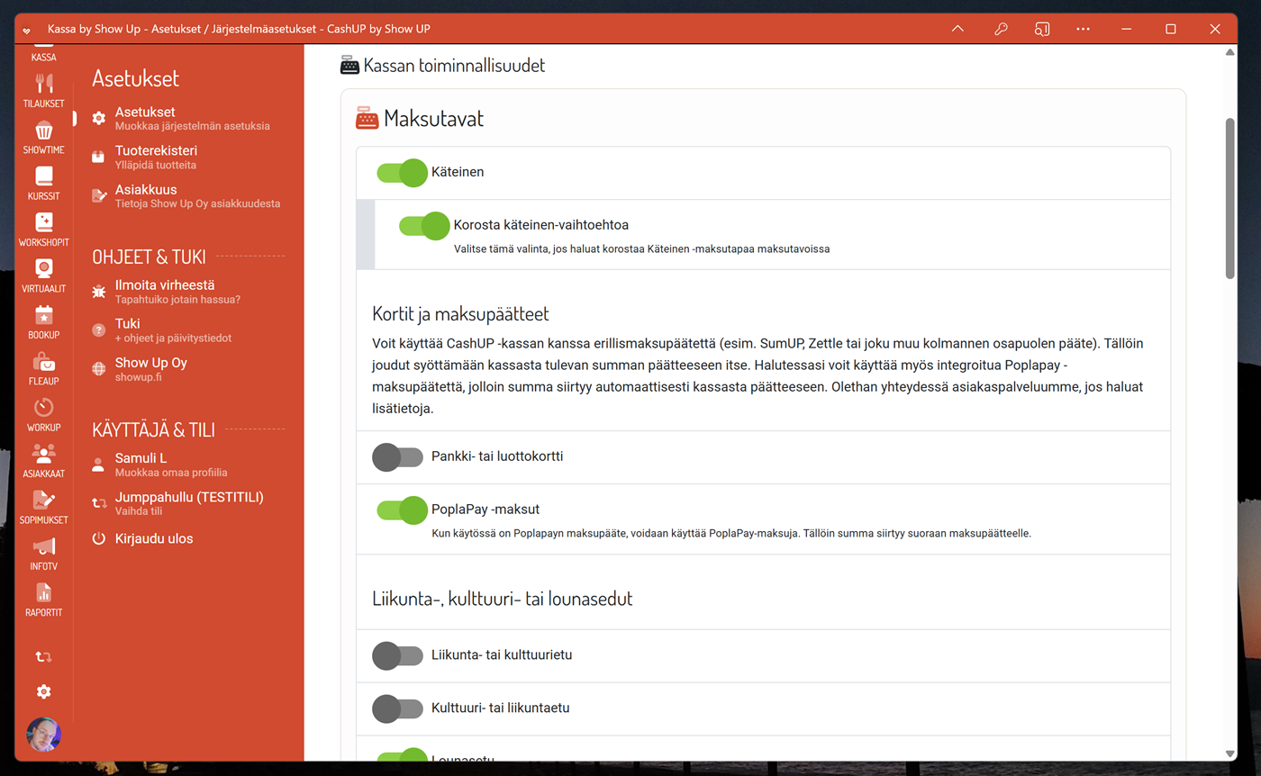 Voit halutessasi määrittää järjestelmään pankkikortin tyypin, sekä kytkeä maksutapahtumiin SumUpin tai Zettlen rajapinnat.