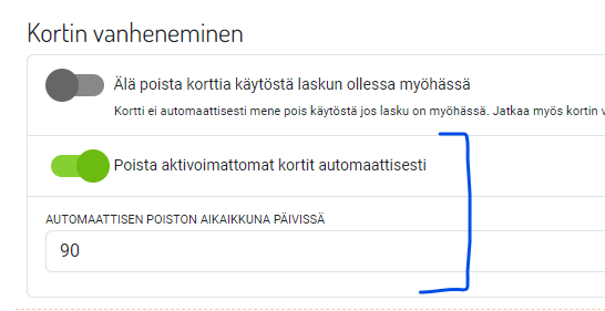 - FeelUP -kortille, jota ei ole aktivoitu, voidaan määrittää automaattinen poistumisaika, löydät sen FeelUP -asetuksista, kohdasta Muut asetukset, Kortin vanheneminen