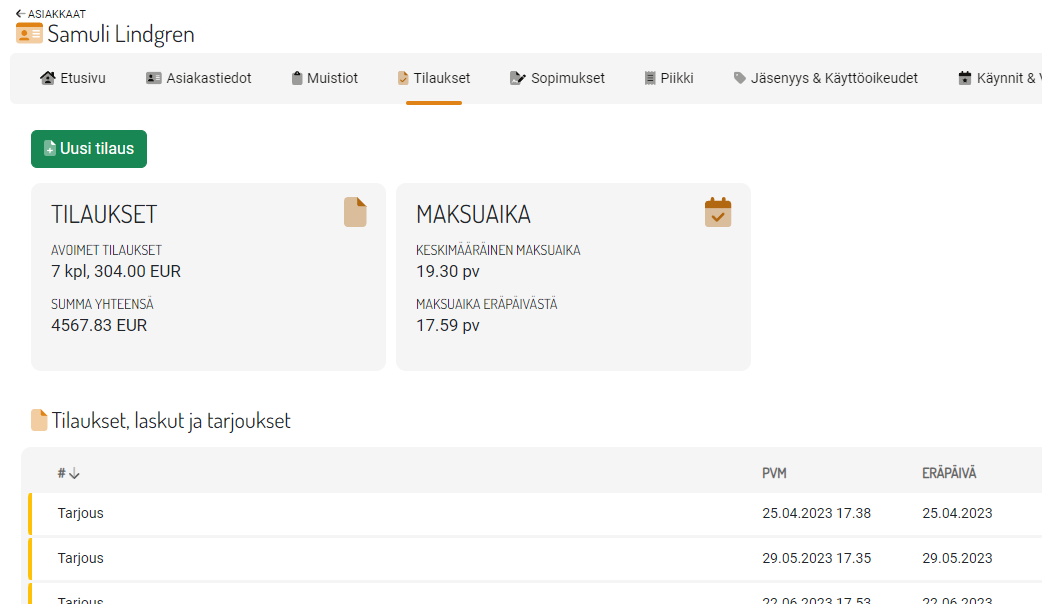 Asiakkaan tilaukset -näkymään on tullut muutama asiakkuuten liityvä lisätieto näkyville. Avointen tilauksien määrä ja avoin summa, tilauksien summa yhteensä sekä statistiikkaa maksuajasta. Maksuaika lasketaan keskimääräisesti tilauksen laskutuksesta tilauksen kokonaisvaltaiseen maksuun asti.