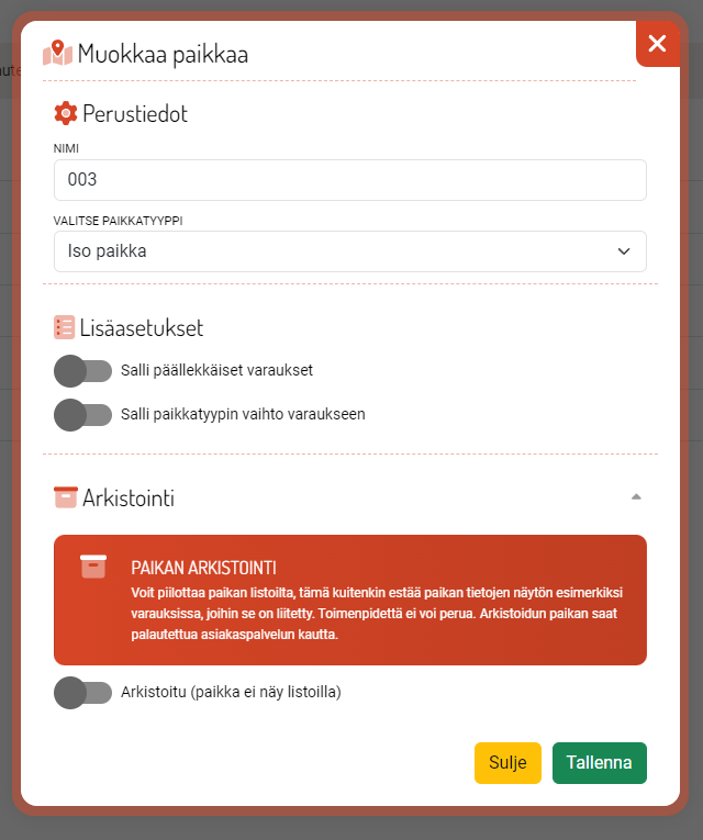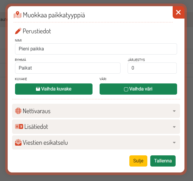 Paikkatyypin muokkaus on nyt päivitetty paremmaksi. Muokkauksen näkymä on ryhmitetty vähän paremmin toimivaksi, ja uuden näkymän avulla voit myös esikatsella asiakkaalle lähetettävää sähköpostiviestiä.