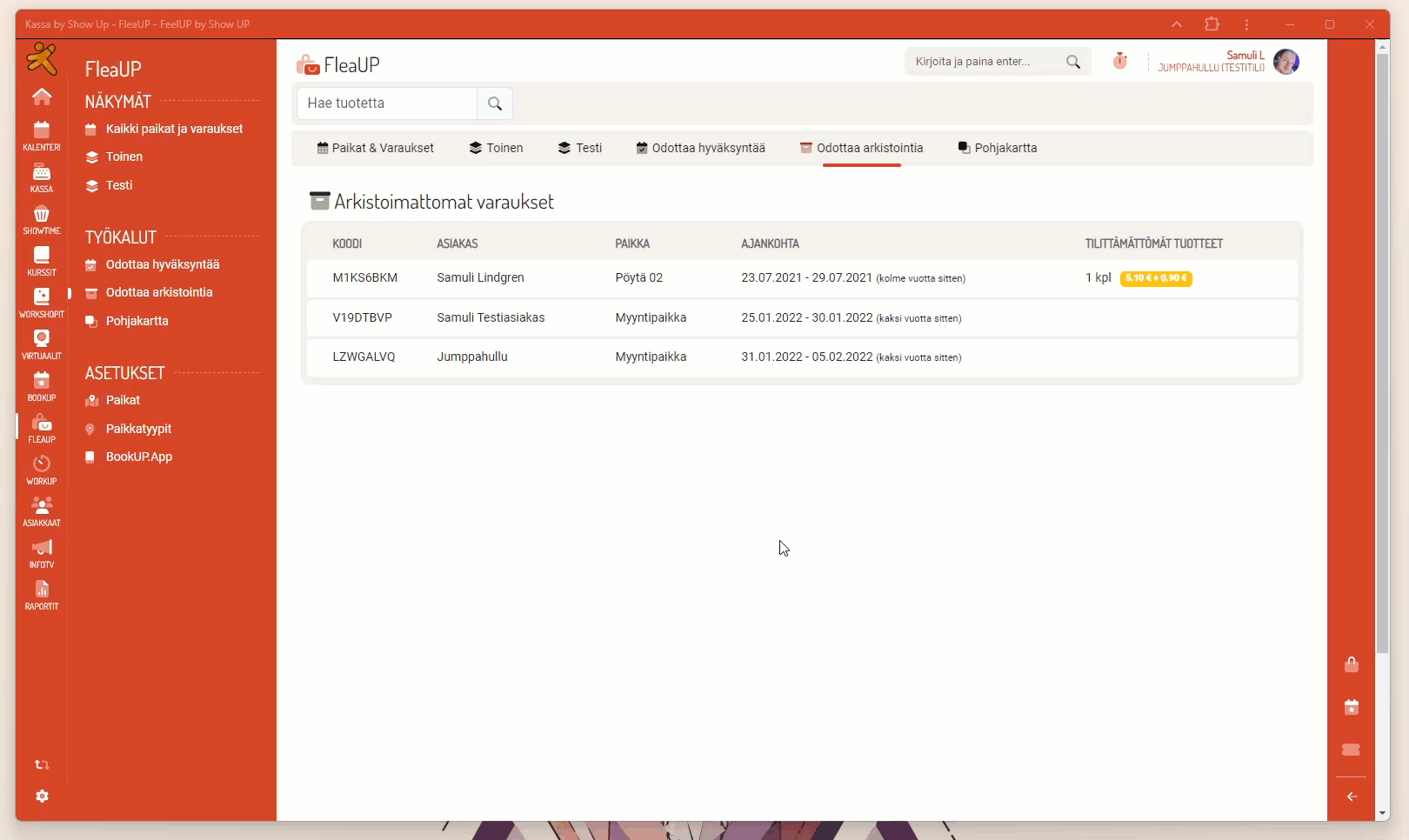 FleaUP -järjestelmän hienosäätö jatkuu (ja jatkuu). Nyt löydät järjestelmästä myös arkistointiominaisuuden paikkavarauksille. Arkistointi poistaa varauksella myynnissä olevat tuotteet järjestelmän rekisteristä siten, ettei ne nouse enää kassan viivakoodihaussa näkyviin.